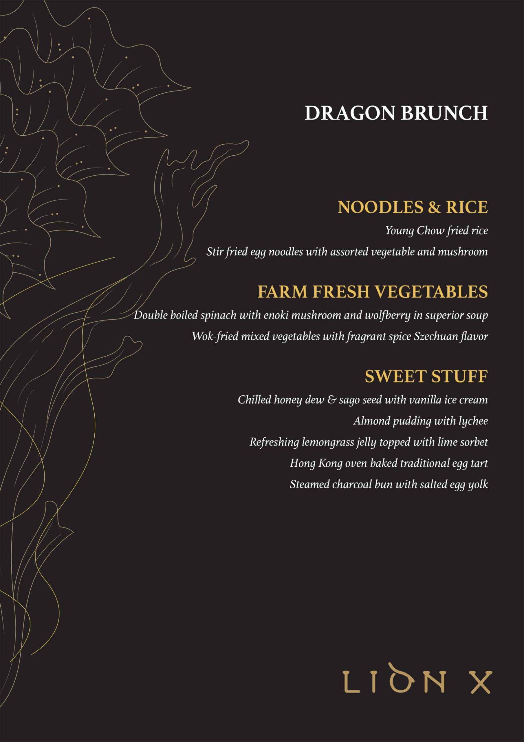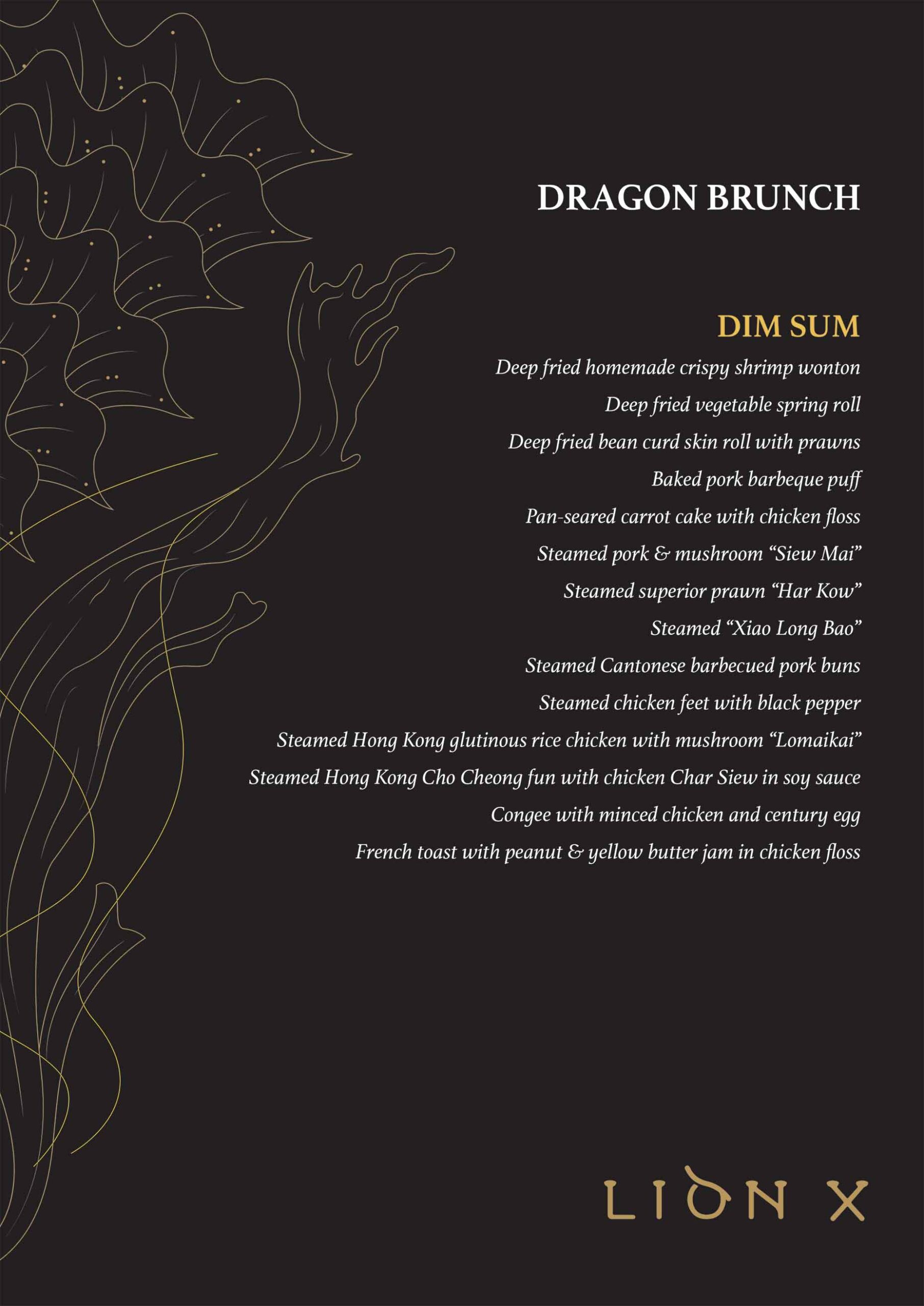 Lion X has finally launched its Dragon brunch for free-flow Dim Sum every Sunday. The offer includes the famous Xiao Long Bao, Pan-fried carrot cake with chicken floss, French toast with peanut & yellow butter jam in chicken floss, Hong Kong glutinous rice chicken with mushroom “Lomaikai”, Hong Kong steamed Cho Chong fun with chicken Char Siew in soy sauce, Deep-fried bean curd skin roll with prawns—and so much more!  And if you’re looking for something other than dim sum? Young chow fried rice and stir-fried egg noodles with assorted vegetables and mushrooms are also offered during the brunch.