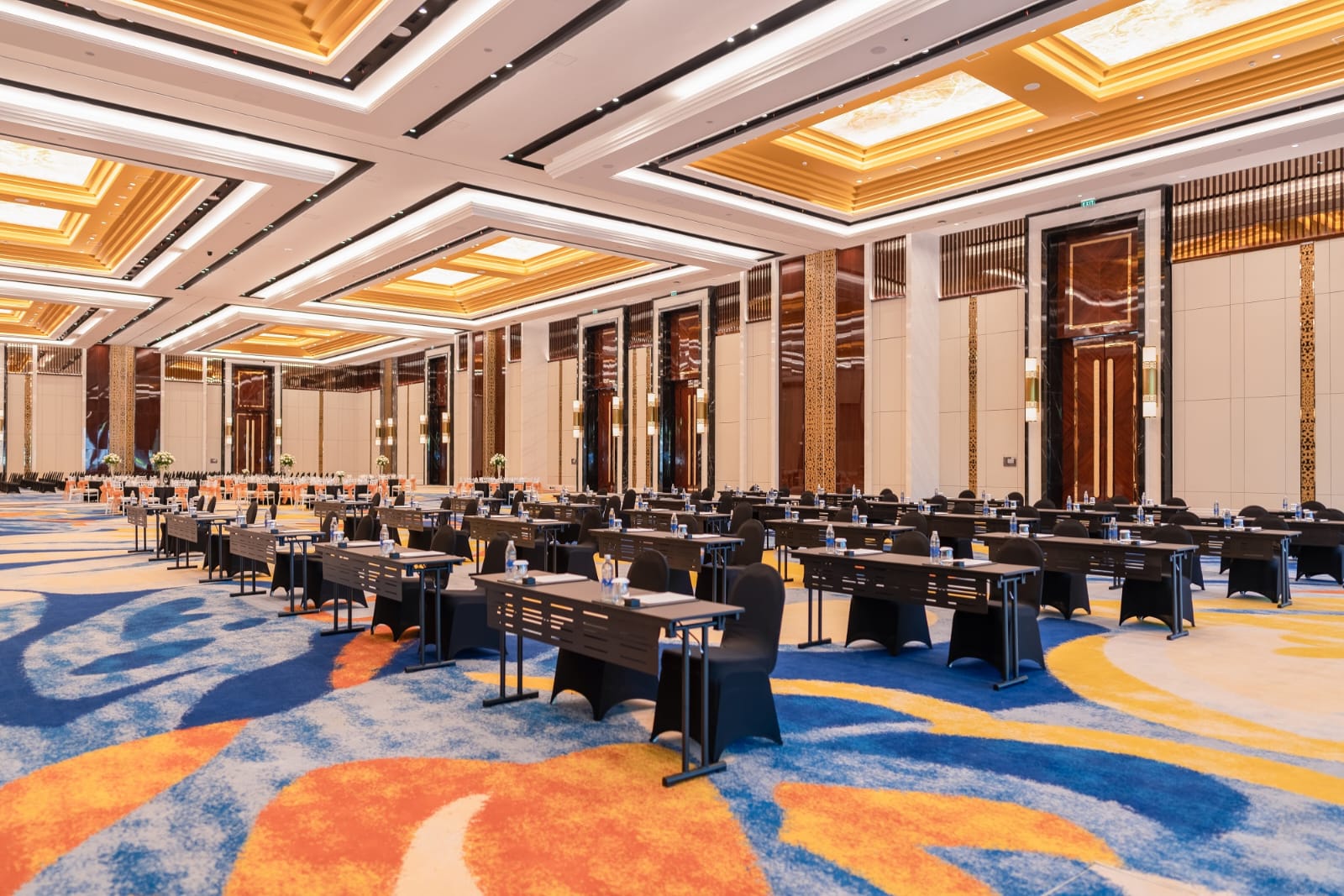 The Imperial Grand Ballroom’s entrances feature a sleek design with floor to ceiling windows to let the natural light in. The design is paired with traditional and contemporary styles embracing natural marble, rosewood panels, and decorative wall lamps and is constructed with clean lines, with a soft, neutral palette of fine linens, and elegant finishes. The Imperial Grand Ballroom has a ceiling height of 10 meters crowned with Alabaster and golden Balinese dedange or steps to accentuate the image of luxury and heritage that signifies the InterContinental brand. The installation of plush carpets with abstract patterns that covers the grand ballroom floor completes the elegant look.